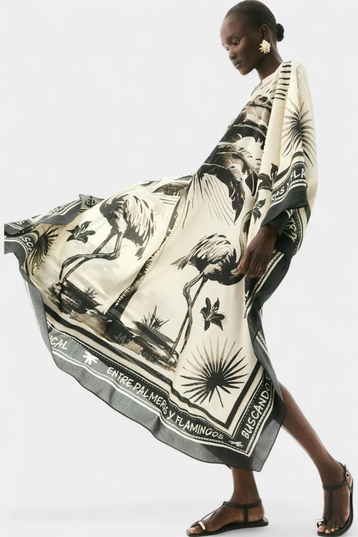 Robe Kaftan Oversized Guadalupe avec Imprimé de Flamants et de Palmiers