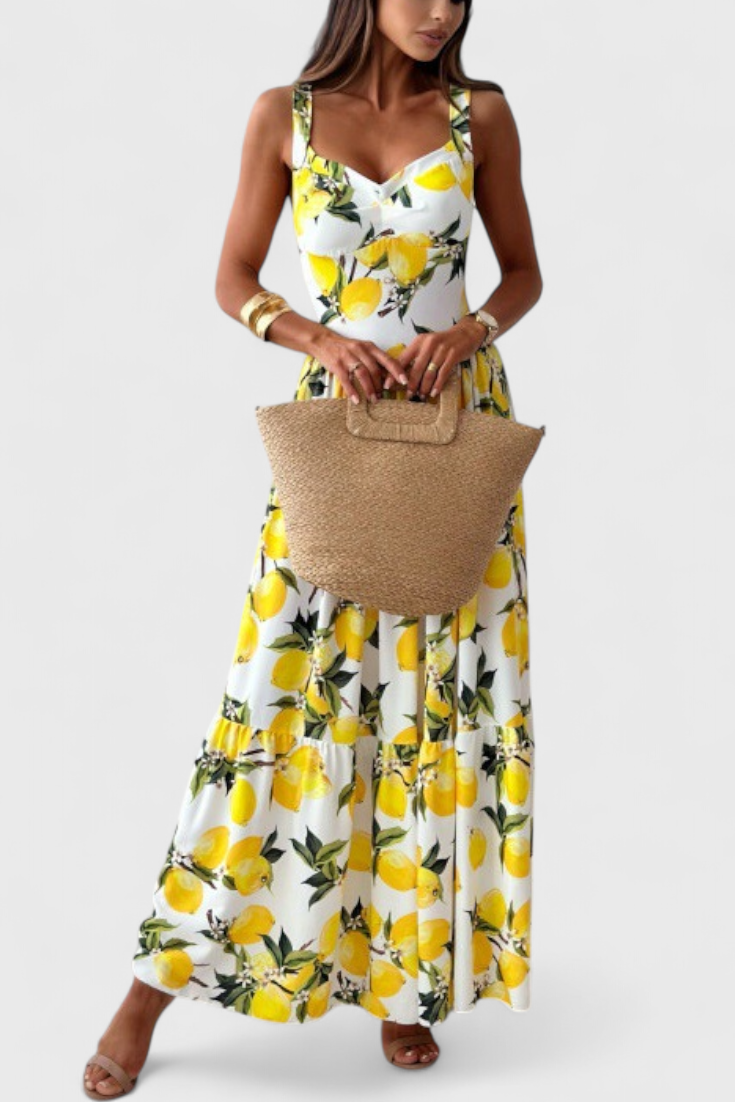 Robe Maxi Imprimée Citron Huda avec Bretelles et Fente Latérale